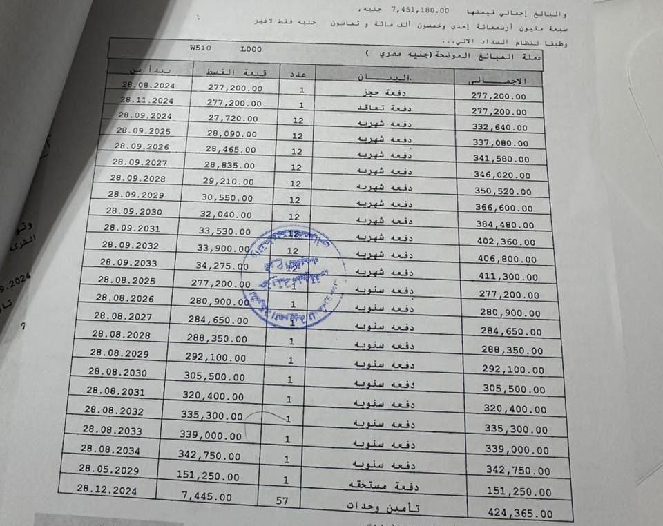 إجمالي السعر: 7,400,000 جنيه علي 10 سنوات